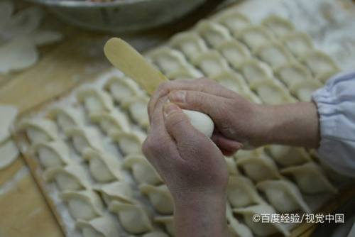 然后将饺子皮对折,然后用手从两面将饺子皮捏合挤压成型