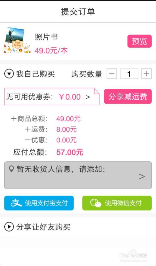制作完成,快速预览。如满意可添加收货信息,支付即可,分享到朋友圈,还能减运费