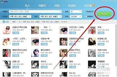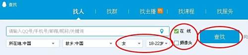 然后就是在好友查找页面查找妹子了。在找人选项中,选择自己想找的省市,还有故乡,接着是性别女,年龄最好是18-22岁的,在线摄像头就随意,选好了点击查找。