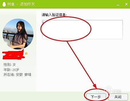 这样我们终于就可以找到绝对靠谱的妹子QQ了,然后我们点击加为好友,一般情况都是要验证的,输入你想写的验证信息(说什么自己想),点击下一步加为好友,就可以等待妹子回复了。如果你写的验证信息好的话,妹子一般都会同意加你QQ的,所以就看你打什么招呼了。