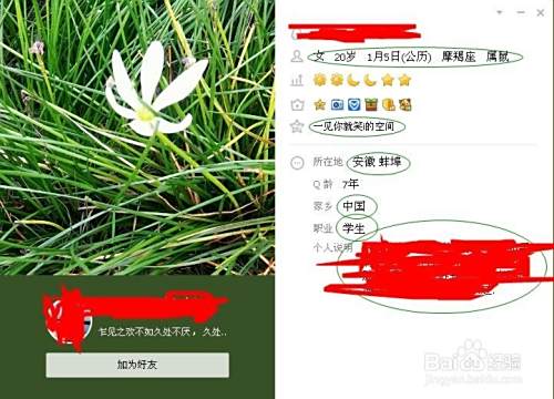于是我们看到一个感觉好的头像,马上点击进入个人简介页面。这时可以看到她的性别年龄生日星座属相,还有QQ空间、所在地、家乡、职业,以及个人说明的信息。只要这些信息全有,而且有真实且比较长的个人说明,那就表示这是个完全可靠的真实妹子。