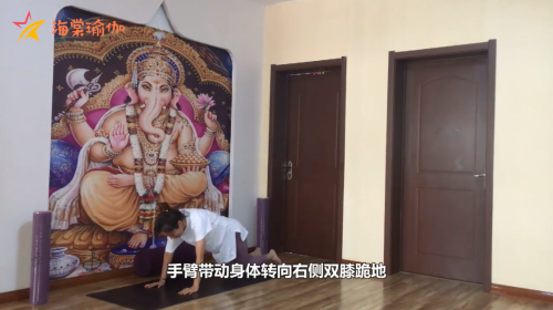 6吸气,头部回正,手臂带动身体转向右侧,双膝跪地。