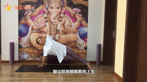 3手臂带动身体向右侧打开,脚尖踩地,眼睛看向上方。