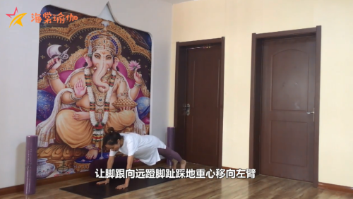 2肘眼相对,伸直膝盖,脚跟向远处蹬,脚趾踩地,重心移向左臂。
