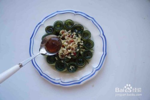 用勺子把调料汁淋到黄瓜上。