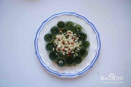 黄瓜卷起来,摆到盘中,上面放蒜末,用剪刀把红辣椒剪碎也放在上面。