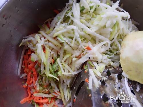 然后,用刮刀将胡萝卜、白萝卜擦成细丝。将黄豆芽(1斤)用清水冲洗干净,空水。
