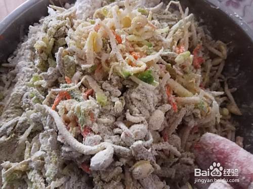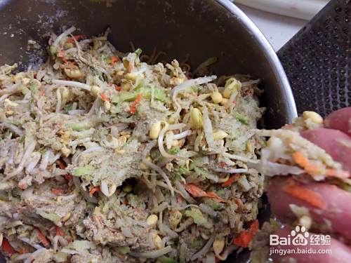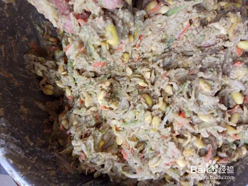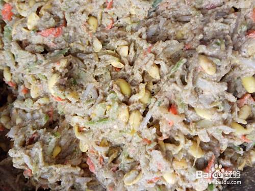 如果过稀,要再加适量的面粉,用手继续搅拌,要保持馅的粘稠度,不能是流体状,应是粘坨状为宜。