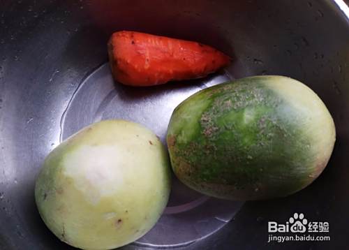 将白萝卜和胡萝卜洗干净,削头去尾,将其表皮不干净处,用刀削掉,再冲洗干净。