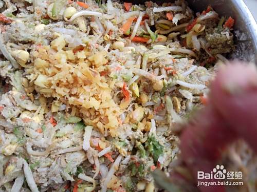 萝卜擦完后,将黄豆芽倒入盆中,加入白面和绿豆面(1:1),然后再将生姜洗干净切成姜碎,放入盆中。