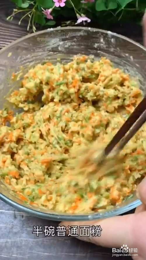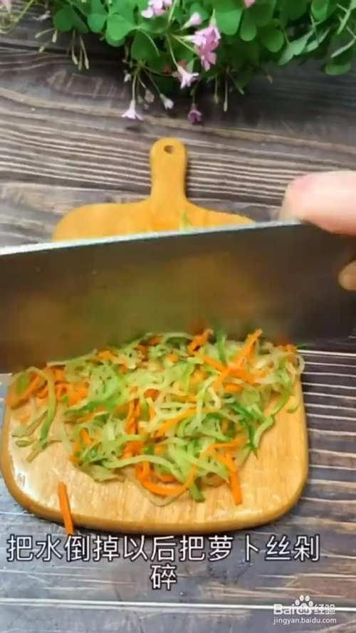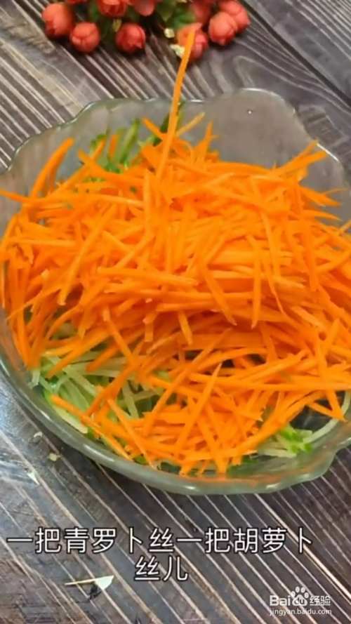 一把青萝卜丝儿,一把胡萝卜丝儿,放一小勺盐,用手抓拌均匀,静置十分钟,腌出多余的水分。