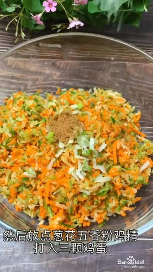 把水倒掉以后,把萝卜丝儿剁碎,然后放点葱花、五香粉、鸡精,打入三颗鸡蛋,拌完普通面粉搅拌均匀。