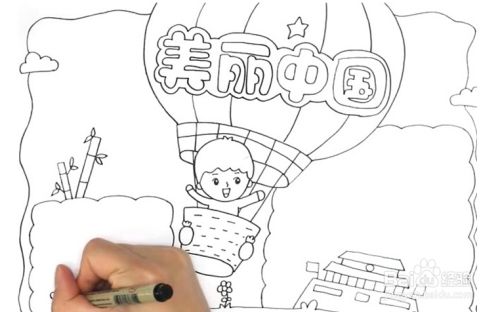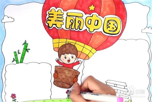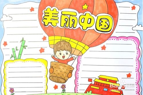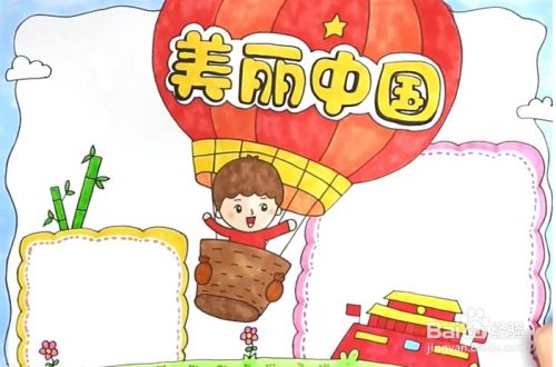 先画出报头,再画一个乘着热气球的小男孩,底部画上草坪,上面画一个倾斜的天安门城楼,再画出背景边框和里面的小边框,补充一些云朵、竹子作为装饰,涂上好看的颜色,画上文字栏,简单的手抄报就画好啦。