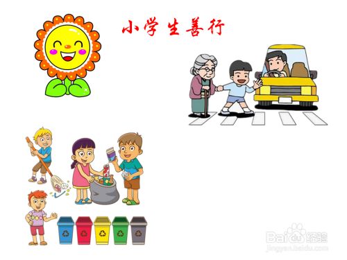 左下方画上几个小学生到扫卫生,垃圾分类的画面;表达“小学生善行”的主题。