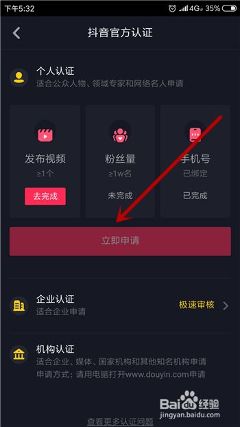 当我们满足了条件后就可以点击下方的【立即申请】选项了,这样就可以成功申请官方认证。