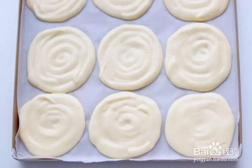 在烤盘里划圈挤出8cm左右小圆饼(我挤了大概9个),震两下烤盘震出大气泡;