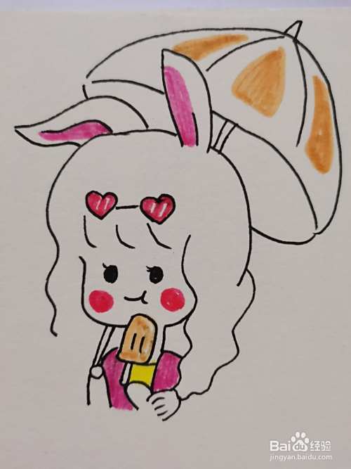 天气炎热,要注意防晒,还是给她加上太阳伞吧,涂上颜色,完成!有没有萌到你呢?
