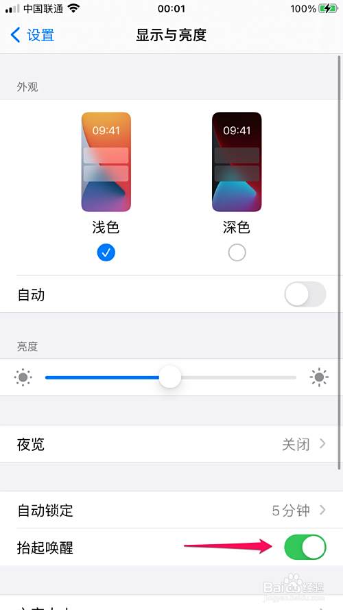 显示与亮度界面点击”抬起唤醒“后面的圆点