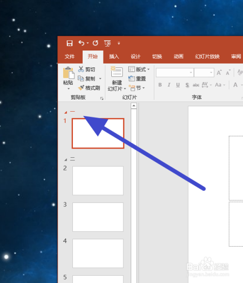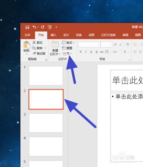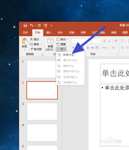 首先我们打开一个ppt,创建几张幻灯片,然后选中第二张幻灯片,点击开始中的节功能。