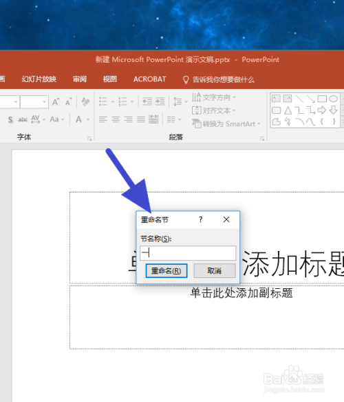 接着意见自动跳出来了,重命名节的选项卡,我们可以根据自己的需要输入名称,然后点击重命名按钮。