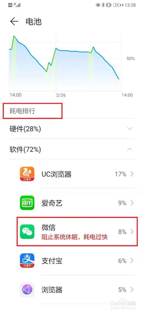 在电池页面,查看耗电排行列表,选择具体应用耗电选项。