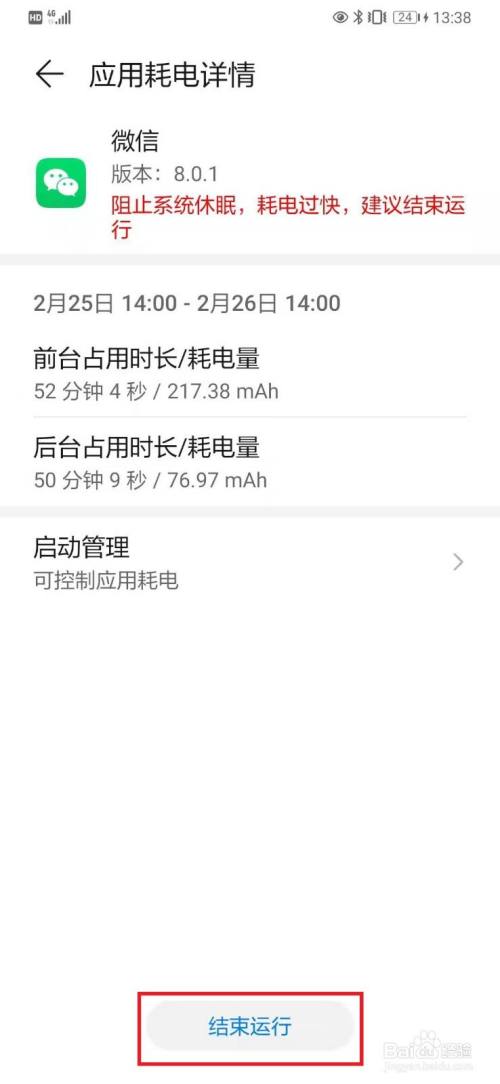进入应用耗电详情页面,点击【结束运行】,关闭高耗电的应用即可。