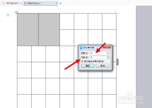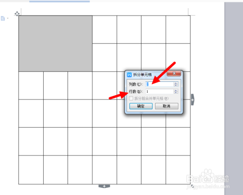 这时会弹出一个小的对话框,如图,我们可以在其中设置拆分后的单元格的列数和行数。然后点击确定按钮。