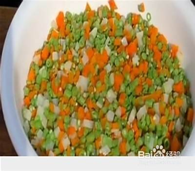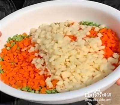 豆角洗净切碎,土豆胡萝卜去皮切小丁。