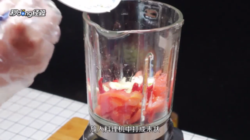 3依次把西红柿、辣椒、姜、蒜放入料理机中,打成末状。