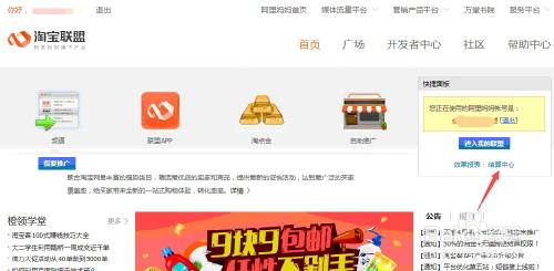 进入淘宝联盟首页,点击右侧快捷面板下的“结算中心”,进入结算页面