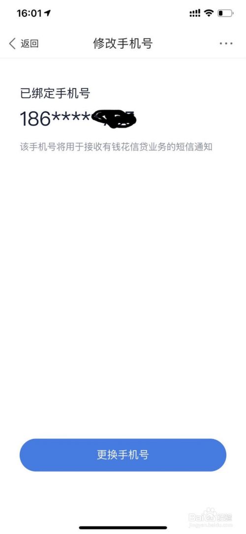 在设置中点击第6项“贷款通知手机号”,进入修改手机号页面后点击“更换手机号”