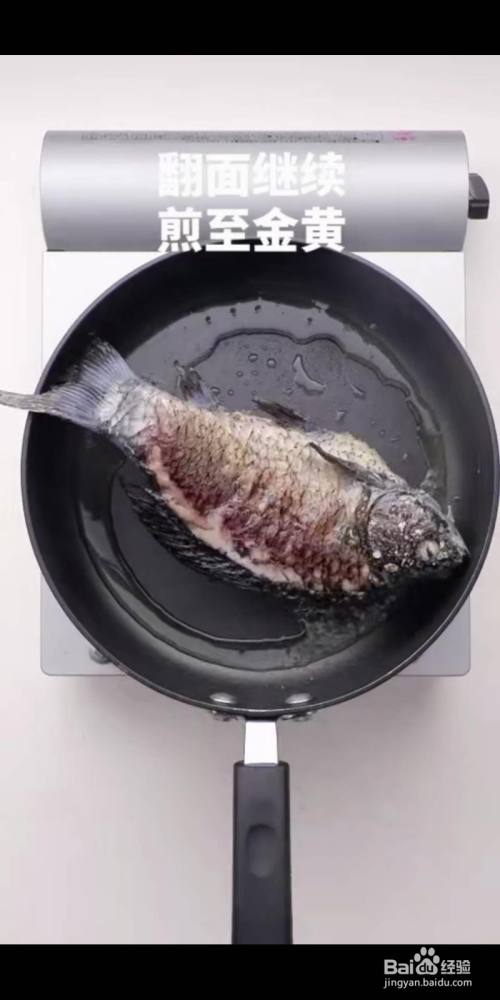 鲫鱼擦干水分,锅内放油,中火煎到一面金黄,翻面,继续煎到金黄。