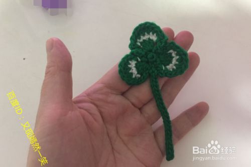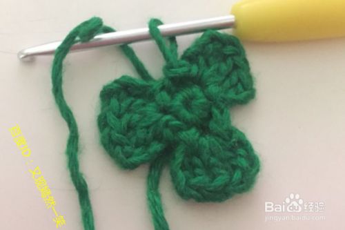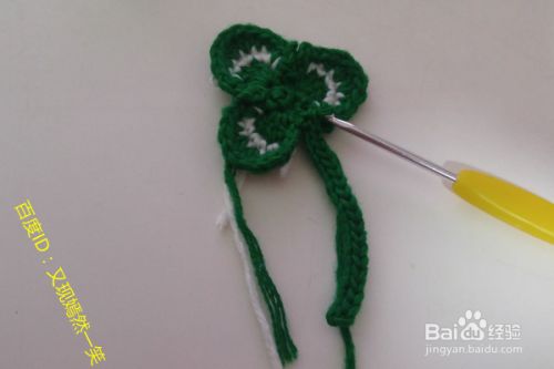 3组的花样都钩织完毕后,再拉20个辫子针,然后返回在倒数第2针开始起顺次钩织引拔针,然后抽线断线就可以了,这样一片三叶草就钩织好了。