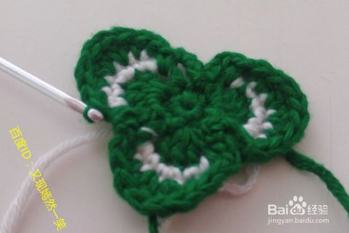第二圈:换白色的线进行钩织,钩针从拉的3辫子针进针,先立一针,然后再在立的针目里钩1个短针,再在下一个长针上钩1个短针,再在下一针上钩织一组的短针加针(一针目里加2针),再在下一针上钩织1个短针,再在另一个3辫子针处钩织一个短针,然后抽线断线,完成一组的钩织,然后再按照3步骤的方法将另外2个的换线花样钩织完毕。