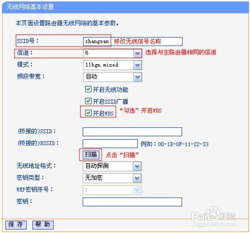 使用修改后的IP地址登录路由器管理界面,点击无线设置>>无线基本设置,设置与主路由器相同的SSID号及信道,勾选开启WDS,点击扫描。