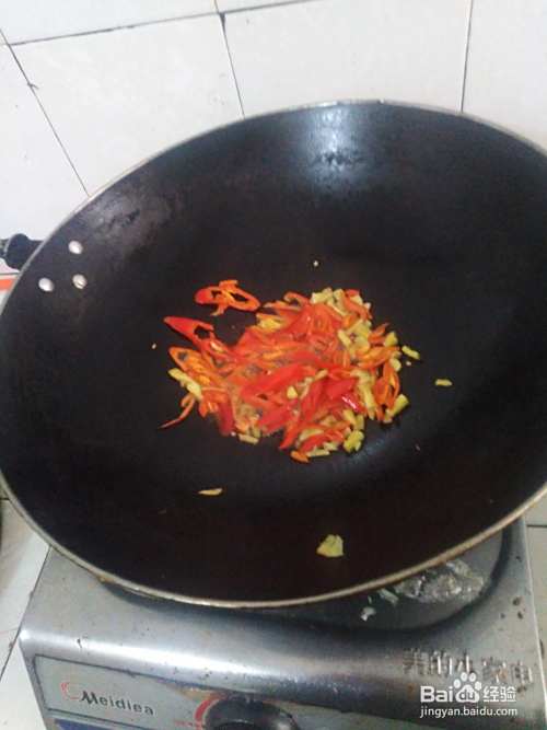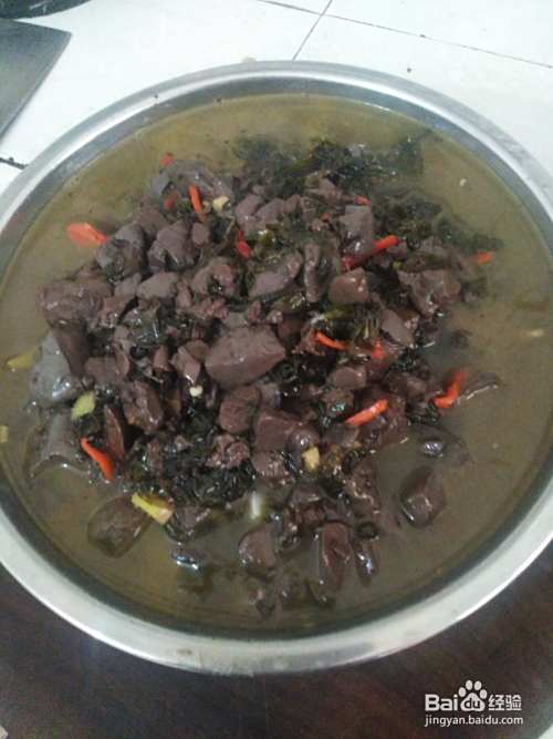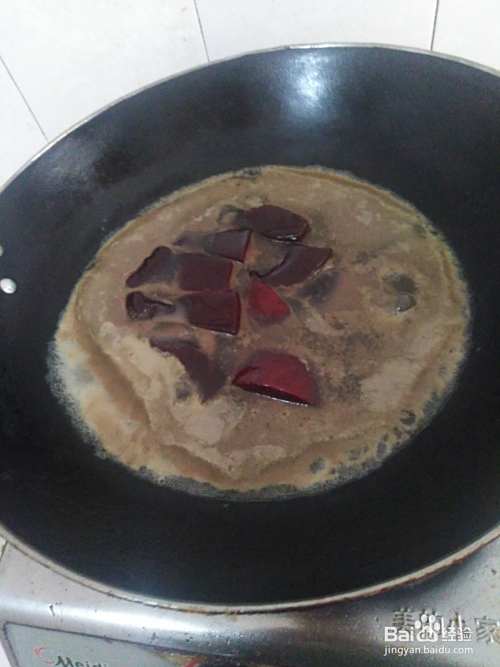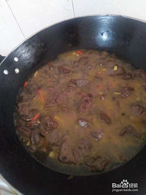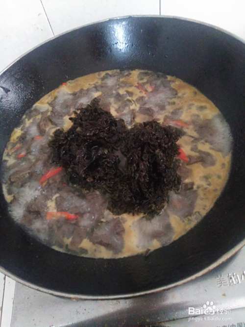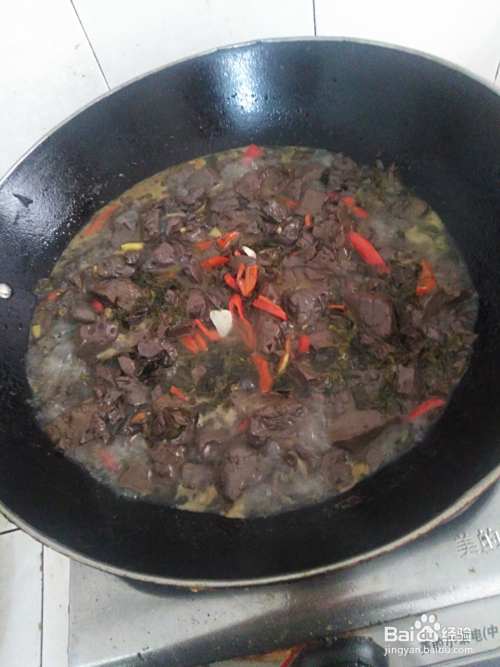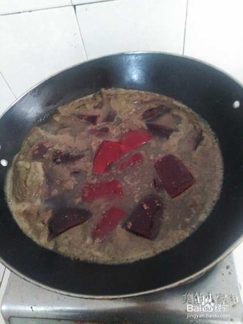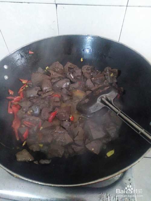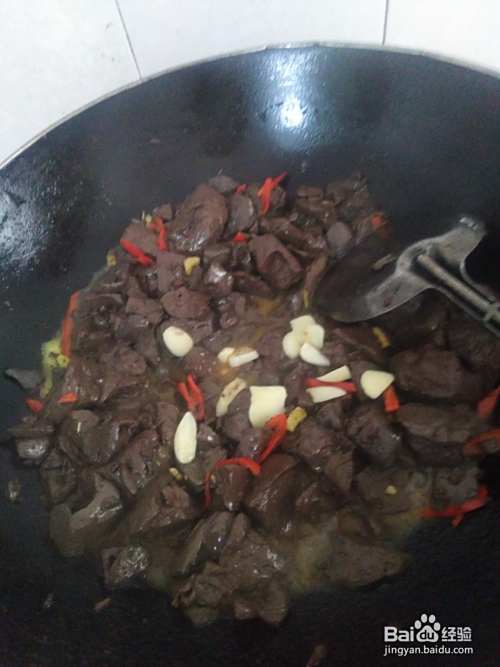 铁锅洗净热油后放红辣椒和生姜炒香,再倒入焯水后的牛血和蒜米、盐炒几分钟然后加水煮开。