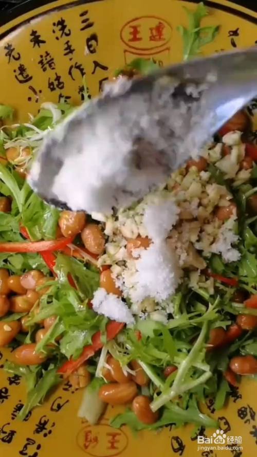 将炸好的花生米倒进去,然后放入食盐、酱油、大蒜、香油、陈醋和白糖。
