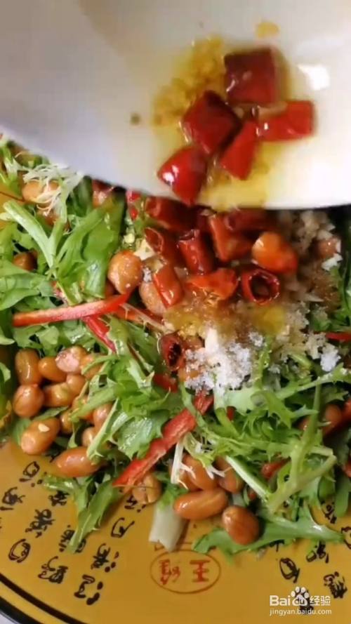 小碗中放入辣椒段,然后淋上一勺热油炸香,最后再倒入苦苣中,搅拌均匀即可食用。