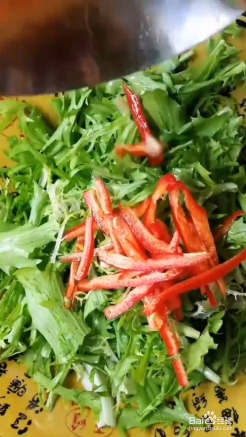 先将苦苣切成段状,然后再将辣椒切成丝儿,一起放入碗中。