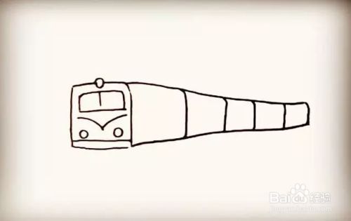 在画出它的车窗一个长方形.下面再画上它的车灯。接着画出火车的车身.二条长长的线越往后边画线距越窄。