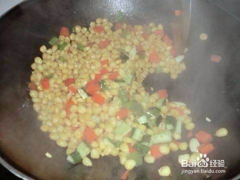 起火,用蒜片爆锅,爆出蒜香后,放入焯好的玉米粒,黄瓜碎块、胡萝卜碎块,在加上精盐、胡椒粉一同翻炒,出锅加入味精即可。