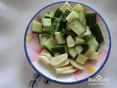将黄瓜、胡萝卜切成碎块。蒜切片备用。