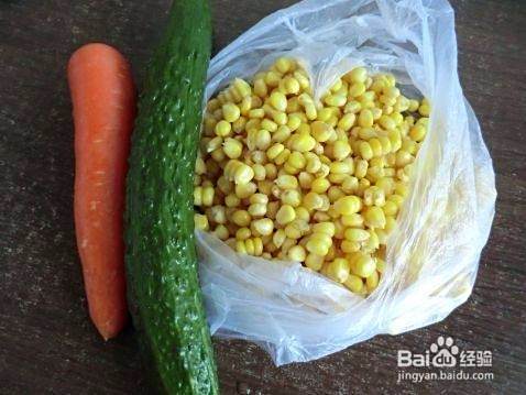 将黄瓜、胡萝卜洗净。准备好玉米粒。(冰箱夏天冻的玉米粒)。