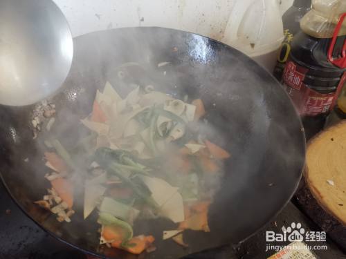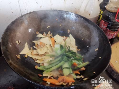 继续翻炒均匀让调味品滋味,在高温作用下,快速渗入到菜品中,并收干汤汁