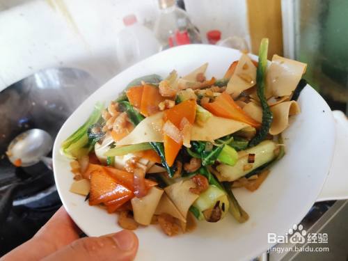 锅中再下入泡发好的干虾仁,在锅中翻炒,让油温激发出干虾仁的海鲜味