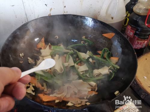 锅中加入调味品盐,对菜品进行调味,用炒勺翻炒,让盐均匀分布在锅中