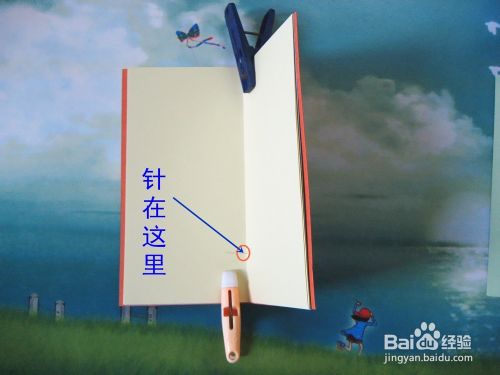 1. 扎眼,如图一:在离下边3厘米处扎眼(如本子厚,分几次扎洞),一共扎4个眼。