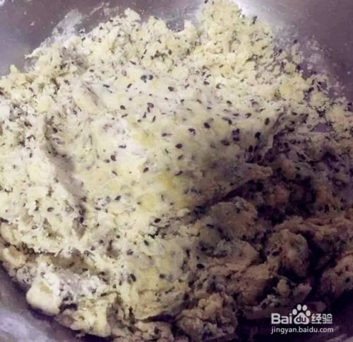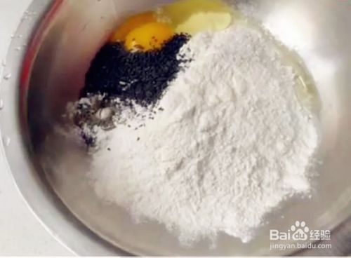 将面粉,鸡蛋,黑芝麻和花生油放入盆中。