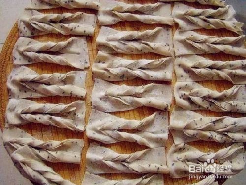 将两个小面片叠在一起中间竖着, 切成 三刀,然后捏住面片的其中一头 ,从中间的那刀切口处翻过来。