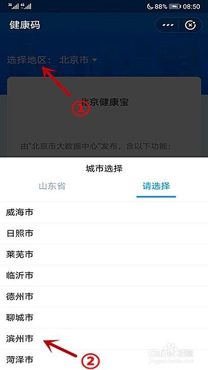 【3】依次点击“选择地区:北京市”、“山东省”、“滨州市”。